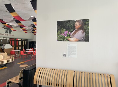 Digital photograph of the interior of the Floy Lewis Bakes Center on the Ursinus College campus. Student photographs of staff, such as Tanya Maute, were created for a documentary photography class and temporarily installed around campus as part of the Spring 2025 COSA celebration.
