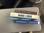 The spines of the books read: "Between Friends, Sharing the Dream, More Than a Game, Sports Matters."
