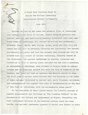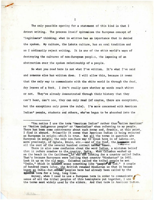 A sixteen page typed and annotated copy of a speech delivered by American Indian Movement activist Russell Means at the Black Hills International Survival Gathering in South Dakota in 1980. In this speech, Means attacks Marxism as simply another in a long line of European thought that opposes the natural order by exploiting Mother Earth and destroying Indigenous peoples.