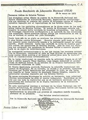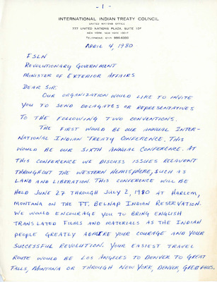 This handwritten letter from William A. Means to the FSLN's Minister of Foreign Affairs urges him to send representatives to two conventions: The International Indian Treaty Conference in Montana and the Black Hills International Survival Gathering in South Dakota. He hopes that the Sandinistas will contribute documentation of the exploitation of the land and people of Nicaragua. Means also requests scholarships for students to study in Nicaragua.