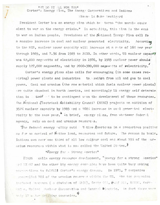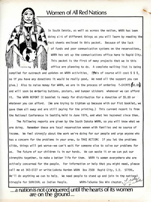 This fact sheet packet, distributed by Women of All Red Nations (WARN), provides information and activity reports on a number of different topics including uranium mining and radiation, water rights and contamination, anti-draft information and the rights of prisoners. It includes reports from the South Dakota Penitentiary in Sioux Falls, the "Great Sioux Nation Meeting" in Pierre and the 36th Session of the Human Rights Commission in Geneva, Switzerland. The packet was distributed circa April 1980.