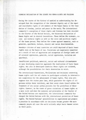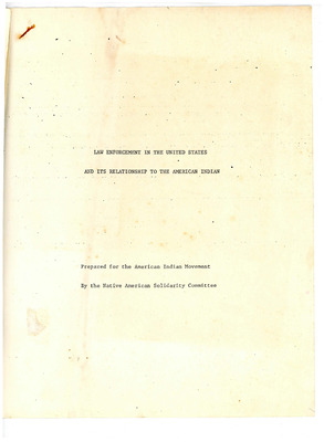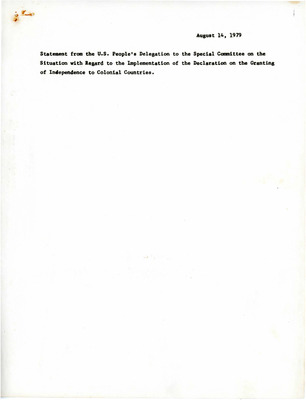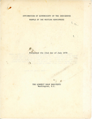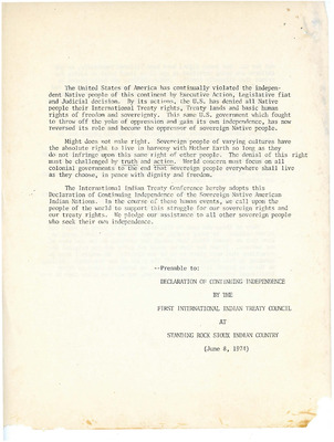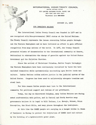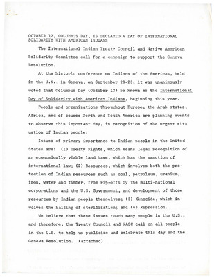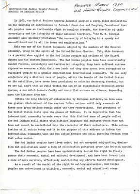 This three-page typed Address on Decolonization was presented by the International Indian Treaty Council to the United Nations Human Rights Commission in March, 1980. It states that the declaration on the Granting of Independence to Colonial Countries and Peoples, adopted by the UN General Assembly in 1960, has not been applied to the Indian peoples oppressed by the United States of America. It lists various ways Indians have been victimized by the US government and provides recommended actions to the United Nations including an investigation of genocidal policies and an examination of the treaties made between the US government and Indian nations.