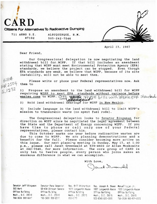 This typed and annotated letter from CARD (Citizens for Alternatives to Radioactive Dumping), dated April 13, 1987 outlines strategies for stopping a proposed land withdrawal bill that would earmark land in New Mexico to be used as a dumping site for radioactive waste. The letter calls for more active engagement from citizens and urges them to contact representatives to voice concerns. Included are notes by an unknown author as well as contact information for senators and congressional representatives.