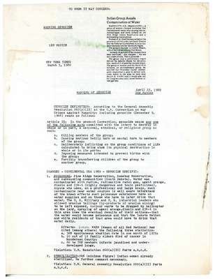 This 4-page report titled "Warning of Genocide" discusses not only the definition of genocide, but also explains directly how the United States participated in the genocide of Indigenous people. Violations include: contamination of natural resources, sterilization, forced relocation and schooling, and invasion of protected reservation lands. The report calls for people to respond, act and resist and provides a list of organizations to support.