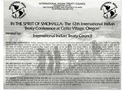 This two-page information pamphlet advertises the 12th International Indian Treaty Conference held June 21-26, 1988, at Celilo Village in Oregon. The conference covers topics such as treaty rights, political prisoners, water and fishing rights, self-government and environmental resources. The pamphlet includes information about the prophet Smohalla, damage to the Columbia River and Celilo Falls, and the imprisonment of salmon fishermen.