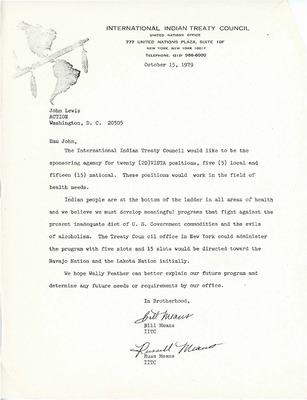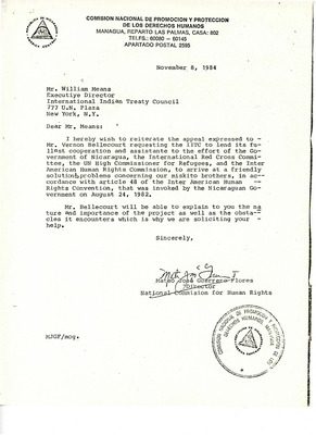 This typed letter to William Means from Mateo Jose Guerrero Flores requests the International Indian Treaty Council (IITC) to cooperate and assist the Nicaraguan government, the United Nations, the International Red Cross and the Inter American Human Rights Commission with problems concerning the Miskito Indians of Central America. He notes that American Indian Movement leader Vernon Bellecourt can provide further details about the project.