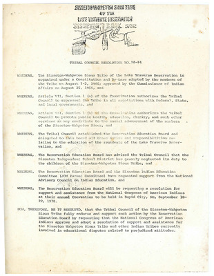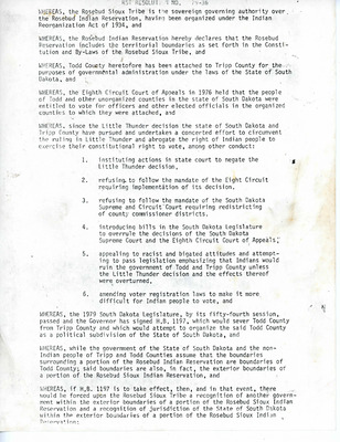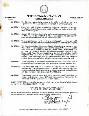 This one-page typed document is a proclamation from the Navajo Nation declaring that September 4-10, 1988, will be known as "American Indian Movement Self-Determination Week." It discusses how, before 1968 and the establishment of the American Indian Movement, matters regarding Indian education, housing, health, civil rights, and treaty rights were ignored. It lists various programs developed to aid Indian self-determination and mentions the twentieth-anniversary gathering to be held in Minneapolis. The proclamation is signed by Peter MacDonald Sr., Chairman of the Navajo Tribal Council.