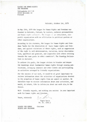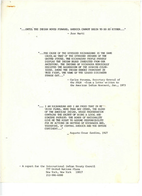 This original 15-page typed report provides a brief history of United States involvement in Nicaragua and the use of violence against the Nicaraguan people including the Miskito Indians. It also includes a detailed timeline of the International Treaty Council Delegation's activities, travels and meetings during their stay in Nicaragua from November 2 to November 15, 1984.