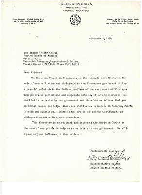This typed letter to William Means from Rev. Fernando Colomer of the Moravian Church in Nicaragua requests the support of the International Indian Treaty Council. It invites the Council to aid discussions with the Nicaraguan government and find solutions to problems concerning the Miskito Indians including those who are held prisoner in the cities of Managua, Puerto Cabezas and Bluefields.