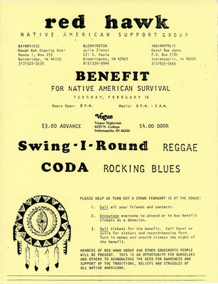 This typed flyer, circa 1980, advertises a Benefit for Native American Survival at the Vogue Night Club in Indianapolis, Indiana, on February 16th. It provides contact information for support groups in Bainbridge, Bloomington and Indianapolis and notes that grassroots groups will be in attendance. The benefit concert includes reggae and blues music.