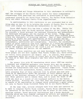 This typed document from the Trinidad and Tobago Peace Council delegation likely originates from the International Conference in Solidarity with the Independence of Puerto Rico, held in Mexico City November 30th to December 2nd, 1979. The statement condemns United States imperialism and expresses support for independence movements in Puerto Rico and other countries around the world. It notes that the "Puerto Rican model of development" is threatening the independence of Trinidad and Tobago and others in the Caribbean.