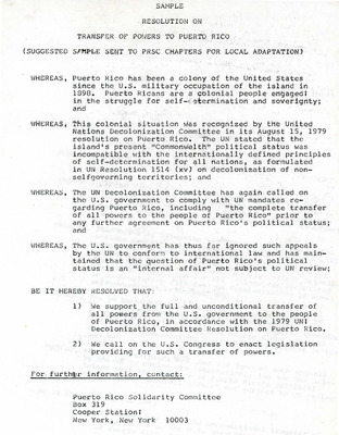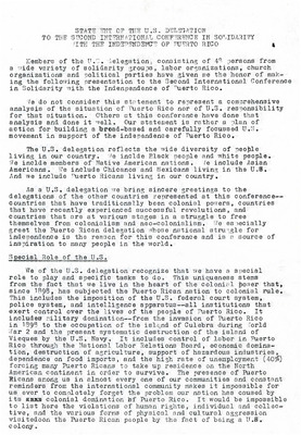 This four-page typed document is a statement from the United States delegation presented at the Second International Conference in Solidarity with the Independence of Puerto Rico, held in Mexico City November 30th to December 2nd, 1979. It provides a history of U.S. colonial rule in Puerto Rico and the negative impacts this has had on its people. It also discusses the role of propaganda in the U.S. which has kept many ignorant of U.S. imperialism and states the importance of educating the American people.