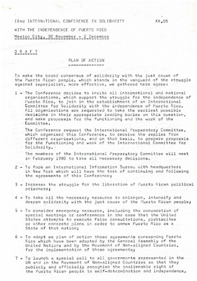 This two-page typed draft plan of action was written at the Second International Conference in Solidarity with the Independence of Puerto Rico, held in Mexico City November 30th to December 2nd, 1979. It provides fourteen points of agreement which outline a plan of action for the international community to better support the cause of independence for Puerto Rico. This includes the desire to recognize Puerto Rico as a Caribbean country with ties to the Latin American family of nations.