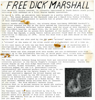 This typed flyer, circa 1980, was produced by the Dick Marshall Defense Group. It provides details and background on the case, stating that Dick Marshall was wrongfully convicted of first-degree murder because of his activism at Pine Ridge Reservation in South Dakota from 1972-1976, making him a target of the federal government. It encourages people to donate to the defense fund and participate in a letter-writing campaign demanding a new trial.