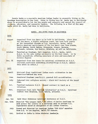 This typed document, circa 1983, outlines the activities of Dennis Banks in California from 1976-1982, prior to his move to the Onondaga Reservation in New York. It lists events that Dennis Banks helped organize, such as the first Sun Dance held in California, the "Longest Walk" protest march, the first American Indian International Arts Exposition and the Airlift of food and other supplies to Indians in Arizona and South Dakota. Many of the activities listed are related to Banks' involvement in Deganawidah-Quetzalcoatl University.