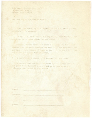 This one-page typed document, circa 1980, is a petition to the South Dakota State Supreme Court for Dick Marshall to receive a new trial. Dick Marshall, an Oglala Lakotah, was imprisoned on a charge of first-degree murder, but later a witness retracted her original testimony, stating she was pressured to accuse Marshall by the FBI. This petition proclaims the innocence of Marshall and demands a retrial.