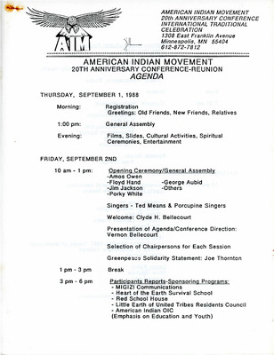 This six-page typed document is an agenda for the American Indian Movement 20th Anniversary Conference, which took place from September 1st to September 6th, 1988, in Fort Snelling State Park, Minnesota. It details the ceremonies, entertainment, reports and speakers for each day and notes topics of concern including health, education, treaty rights and international solidarity. The last page of the document is a conference registration form.