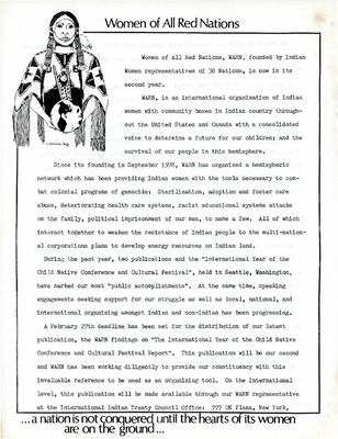 This four-page typed newsletter discusses the history and recent publications of the Women of All Red Nations organization, such as the health and water study of chemical and radiation contamination at the Pine Ridge Reservation water supply. Information sheets are included on the topics of paid sterilization programs and the persecution of political prisoners such as Leonard Peltier.