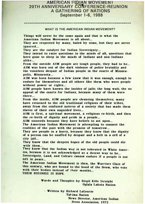 This one-page typed document is a speech given at the 20th Anniversary Conference-Reunion of the American Indian Movement held from September 1-6, 1988. The speech, given by Birgil Kills Straight of the Oglala Lakota Nation, describes how AIM formed to stand up for those without power or rights to establish Indian sovereignty. It also discusses the spiritual aspects of AIM and states that its members belong to a rebirth of the Warriors Class in this century.