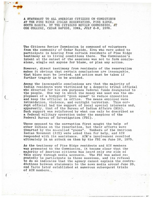 This three-page typed Address on Decolonization was presented by the International Indian Treaty Council to the United Nations Human Rights Commission in March, 1980. It states that the declaration on the Granting of Independence to Colonial Countries and Peoples, adopted by the UN General Assembly in 1960, has not been applied to the Indian peoples oppressed by the United States of America. It lists various ways Indians have been victimized by the US government and provides recommended actions to the United Nations including an investigation of genocidal policies and an examination of the treaties made between the US government and Indian nations.