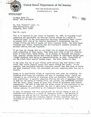 This is a copy of a two-page typed letter from an Associate Director of the US Interior Department, Ronald E. Lambertson, that was sent to Alan "Redshirt" Lewis, Sr. on December 7, 1983. The letter is in response to Lewis' request for American Indians to present their views on the killing and sales of eagles and other migratory birds. Lambertson outlines the history of the Endangered Species Act and other laws meant to protect migratory birds such as bald and golden eagles and presents data surrounding the prosecution of those charged with illegally selling protected bird species. He also notes that eagle feathers may be used by Indian tribes for religious purposes and describes legal methods by which feathers may be acquired.