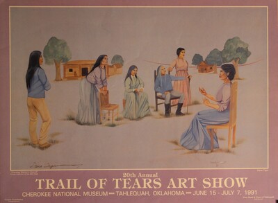 This original poster advertises the 20th annual Trail of Tears Art Show held at the Cherokee National Museum in Tahlequah, Oklahoma from June 15 to July 7, 1991. The poster features a painting by Dana Tiger entitled "Cherokee Women's Council."