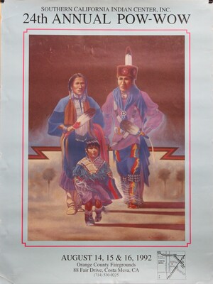 This original event poster advertises the 24th annual Pow-wow hosted by the Southern California Indian Center Inc. The poster features art by Harold Freeland and depicts an Indigenous family. The event was held at the Orange County Fairgrounds August 14th to August 16th, 1992.