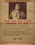 This original poster advertises the Crow Dog Sun Dance held August 5-8, 1976 at the Rosebud Reservation in South Dakota. The poster features a photograph of spiritual leader Leonard Crow Dog who, at the time of this event, was serving a prison sentence for his role in the occupation of Wounded Knee. Text on the poster reads: "Crow Dog is in penitentiary but the Sun Dance will go on. Crow Dog is speaking to his nation."