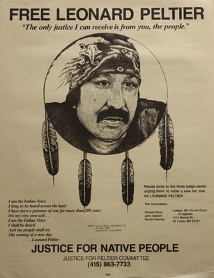 An original poster produced by Sequoyah Graphics urging the public to contact the three-judge panel for a new fair trial for activist Leonard Peltier. Leonard Peltier was arrested for the shooting deaths of two FBI agents at Pine Ridge Indian Reservation in 1975. A committee was established to help Leonard Peltier receive a new and fair trial. The poster features a quotation from Peltier along with his portrait, an eagle and feathers. Text on the poster reads: "Justice for Native People."