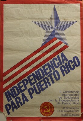 This original poster advertises the second International Conference in Solidarity with the Independence of Puerto Rico, held in Mexico City November 30th to December 2nd, 1979. The poster features red and white stripes and a single star as seen on the flag of Puerto Rico. It also contains a seal of the Communist Party of Mexico. The Puerto Rico independence movement is a call for the island of Puerto Rico to be independent from the United States of America.
