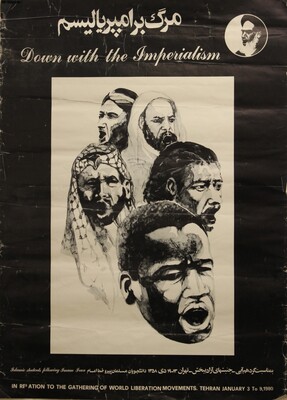 This original poster advertises the Gathering of World Liberation Movements held in Tehran, January 3-9, 1980. The poster features a profile of Ayatollah Khomeini as well as the faces of other men, including Yasser Arafat. Text on the poster reads: "Down with the imperialism" and "Islamic students following Imam Iran."