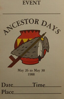 This copy of an event poster advertises Ancestor Days from May 26 to May 30, 1988. The specific purpose or location of the event is unknown. The poster features an image of pottery, a feather and an arrowhead.