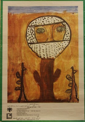 This original poster features art depicting a freedom fighter and weapons created by a Palestinian child, Ilham Shahrour, in 1979. The child was twelve years old at the time. The poster was produced by the Plastic Arts Section of the Palestine Liberation Organization (PLO).