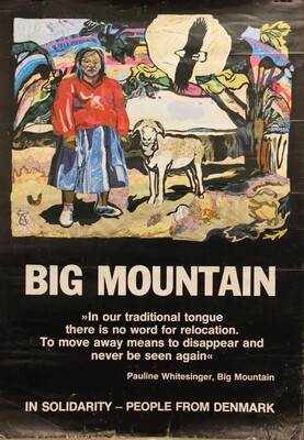 This original poster promotes solidarity between the Indigenous people of Big Mountain, in the United States, and the people of Denmark. It features artwork depicting an Indigenous woman, a sheep and an eagle. It also contains a quotation from Pauline Whitesinger: "In our traditional tongue there is no word for relocation. To move away means to disappear and never be seen again."