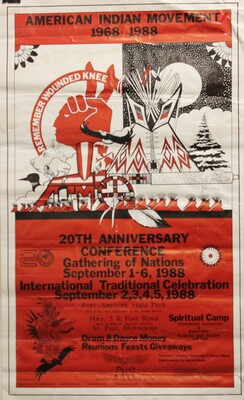 This original poster advertises the American Indian Movement 20th anniversary conference held in Fort Snelling State Park, Minnesota, from September 1-6, 1988. The conference was comprised of both a "Gathering of Nations" and an "International Traditional Celebration." Art on the poster, by Blake, depicts animals, teepees and a medicine wheel. Text on the poster states: "Remember Wounded Knee."