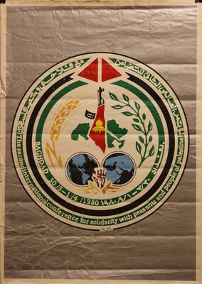 This original poster advertises the Second International Conference for Solidarity with Peasants and People of Palestine, held from March 30 to April 1, 1980, in Baghdad, Iraq. The poster, in English and Farsi, features Palestinian flag colors as well as a blue globe, a black hand, agricultural crops and a map of Palestine in the form of a gun. The conference supported Palestinian people's rights and the formation of an independent state.