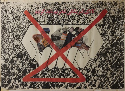 This original poster, dating from circa 1979, promotes a boycott of products from America including military weapons, automobiles, electronics, cigarettes and food. It contains text in Farsi.