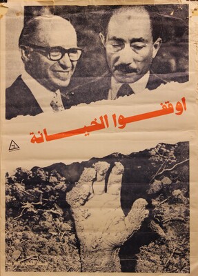 This original poster, dating from circa 1978, features a photograph of Israeli Prime Minister Menachem Begin (left) and Egyptian President Anwar Sadat (right) who signed the Camp David Accords. Text on the poster, in Arabic, reads: "Stop the Deception". An open hand lies in dirt at the bottom of the poster, which was published by the Arab Liberation Front, a Palestinian political party controlled by Iraq.