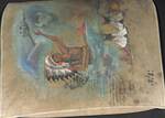 This image shows the rear view of the canvas satchel carried by AIM activist John Thomas during the Longest Walk demonstration in 1978. The case was used to carry documents collected during the march across the United States. Images on the case were painted by companions along the way.