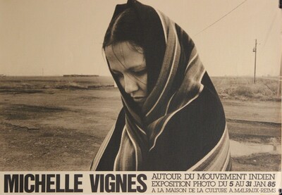 This original poster advertises an exhibition of photography by artist Michelle Vignes held from January 31st to August 5th, 1985, at the Maison de la Culture André Malraux in Reims, France. The poster features a photograph of Darlene Nichols, the common-law wife of American Indian Movement activist Dennis Banks.