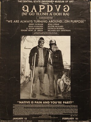 This original poster advertises an art exhibition held at the Central State University Museum of Art, circa 1986. The poster features a photograph from the “Street Chief Series” by Richard Ray Whitman. Under the photo is a paragraph titled "Native is Pain and You're Part?" written by Edgar Heap of Birds.