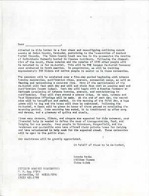 This one-page typed photocopied form letter from Citizens Against Desecration was created in 1988 to inform residents about the desecration of American Indian burial grounds in Union County, Kentucky. The letter provides details about the planned five-day reburial ceremony (the largest ever conducted in North America) including tobacco burning, prayers, songs and fasting. The letter requests financial help to cover food, transportation and lodging costs for those expected to attend.
