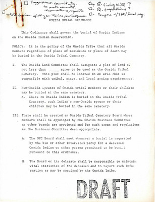 This two-page typed document is a draft of an Oneida Burial Ordinance adopted by the Oneida Tribe of Indians of Wisconsin on May 19, 1989. It outlines rules to govern the burial of Oneida Indians on the Oneida Indian Reservation. This document calls for the creation of a Tribal Cemetery and a Cemetery Board, noting that non-Oneida spouses and children may be buried in the same cemetery. Notes for improvement of the ordinance are included at the top of the draft.