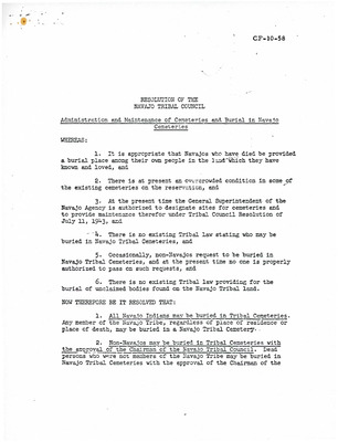 Resolution of the Navajo Tribal Council: Administration and Maintenance of Cemeteries and Burial in Navajo Cemeteries, February 12, 1958