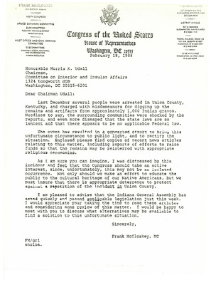 This one-page typed letter from Representative Frank McCloskey to Morris K. Udall, Chairman of the Committee on Interior and Insular Affairs, was sent on February 18, 1988. McCloskey writes about arrests related to the desecration of approximately one thousand Indian graves in Union County, Kentucky. He feels Congress should take action to prevent further incidents and provides news materials for Udall to review.