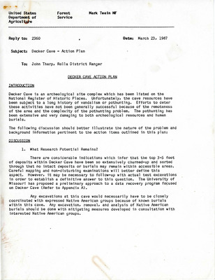 This 20-page typed document consists of an action plan sent to District Ranger John Tharp from archeologist Walter E. Allen on March 23, 1987 as well as supplementary materials about Decker Cave. The plan details the history of vandalism and pothunting at the site, including the disturbance of American Indian burials. It also explores the potential for further archeological exploration of the cave in coordination with concerned American Indian groups and provides a plan to deter additional looting of the site. Supplemental materials include a discussion with the University of Missouri Archeological Department, a review of literature, and maps of the area.