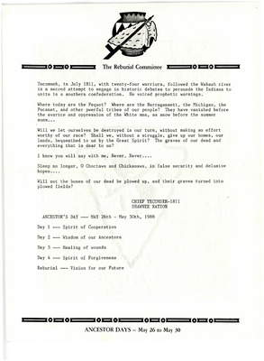 This four-page typed document from the Reburial Committee provides a schedule for Ancestor Days, held May 26th to May 30th, 1988. It includes a photograph of an aerial view of the Slack Farm site of Indian grave looting as well as a list of quotations describing the scale of vandalism at the site. A fact sheet provides information about the destruction and recent legislation related to grave desecration.