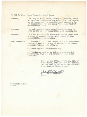 This one-page typed document is a declaration by William C. Villines, Mayor of the City of Providence, Kentucky. He proclaims that February 3rd, 1988, is Citizens Against Desecration Day. The proclamation recognizes the leadership and support for those who are involved.