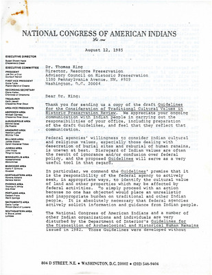 This typed letter from Suzan Shown Harjo, Executive Director of the National Congress of American Indians, was sent to Dr. Thomas King, Director of Resource Preservation for the Advisory Council on Historic Preservation, on August 12, 1985. Harjo praises the new draft Guidelines for the Consideration of Traditional Cultural Values in Historic Preservation Review because they promote active consultation with American Indians before grave sites are disturbed and favor reburial of remains over perceived scientific value. She contrasts the draft Guidelines with those of the U.S. Department of the Interior, which heavily favor the self-interests of archeologists and anthropologists.