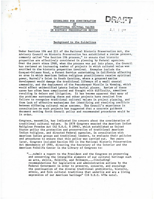 This 21-page typed document is a draft of Guidelines for the Consideration of Traditional Cultural Values in Historic Preservation Review, dated August 1, 1985. The document outlines the Historic Preservation Advisory Council's policies and procedures concerning project planning for historic properties, taking into account the traditional cultural values that may be impacted by such projects. It provides background on the American Indian Religious Freedom Act and contains an appendix dealing with the treatment of human remains.